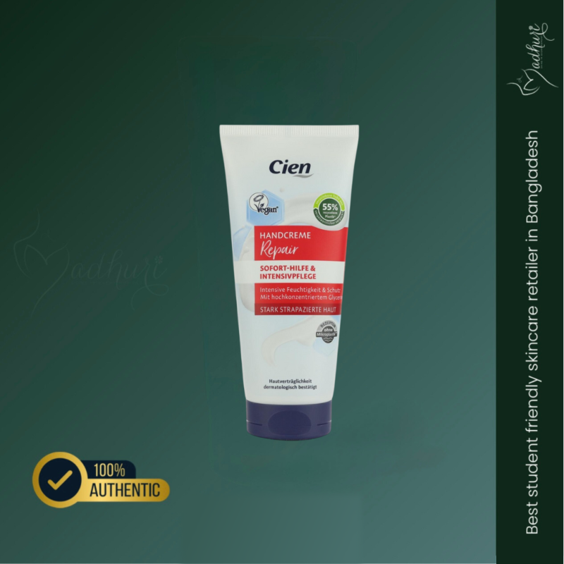 Cien Handcream Repair nourishes and repairs dry, damaged hands with a rich formula that restores moisture and softness. Ideal for frequent hand washing and harsh weather conditions.
