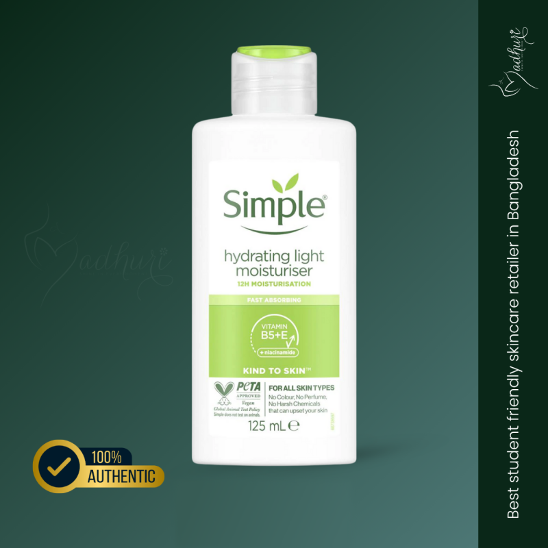 Simple Kind to Skin Hydrating Light Moisturiser provides gentle, effective hydration for sensitive skin. Enriched with vitamins and no harsh chemicals, it helps maintain skin’s natural moisture balance.