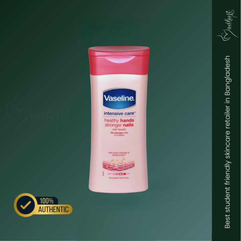 Strengthen nails and hydrate dry hands with Vaseline's nourishing formula. Includes keratin to prevent nail breakage and deeply moisturize the skin.